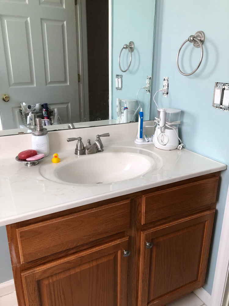 A bathroom painted in Yarmouth Blue by Benjamin Moore