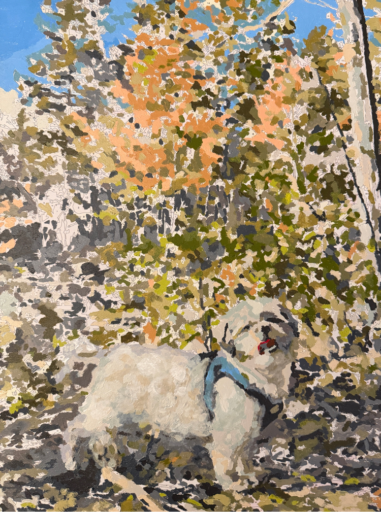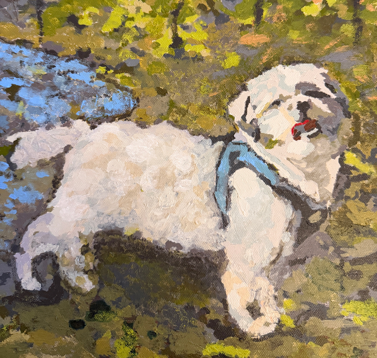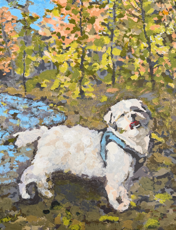 I opted to first work on painting the dog section of my painting, since my pup is the most important part! I was very pleased with how his face came out. But, as I started painting the rest of his body, the colors that were chosen for his fur had a camouflage look to it, with dark grays and greens—it must be because of the shadows that were cast on him in the forest.