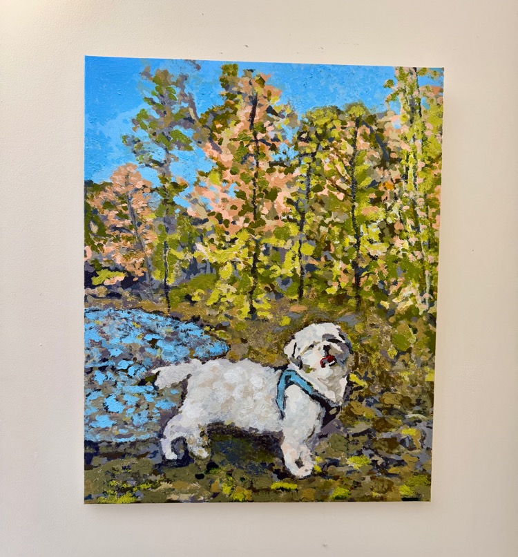I am happy to have a painting of my sweet pup from a fun family trip—it’s a great souvenir! I hung the painting on the wall near the sofa in my family room, so I can remember all the fun times my family and I shared last fall!
