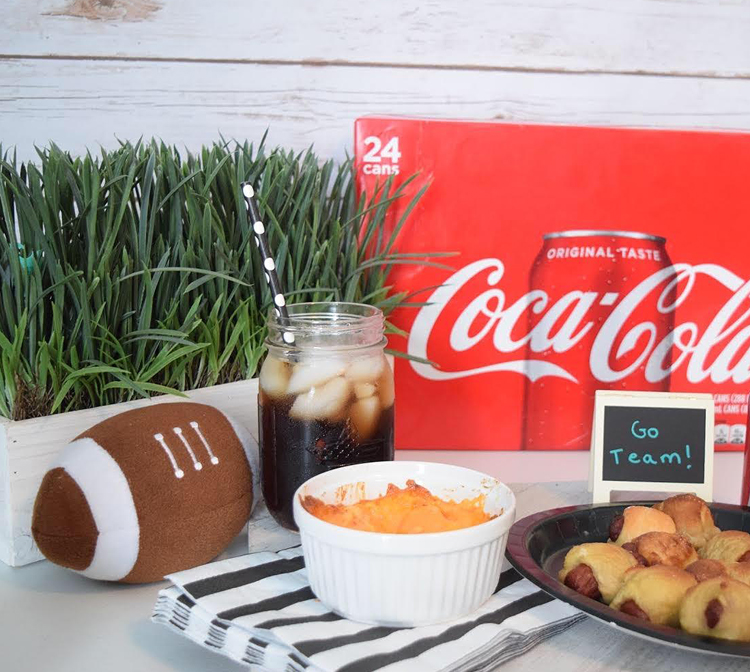 box of 24 cans of Coca-Cola at a fun football watch party with mini pretzel dogs and pimento cheese dip