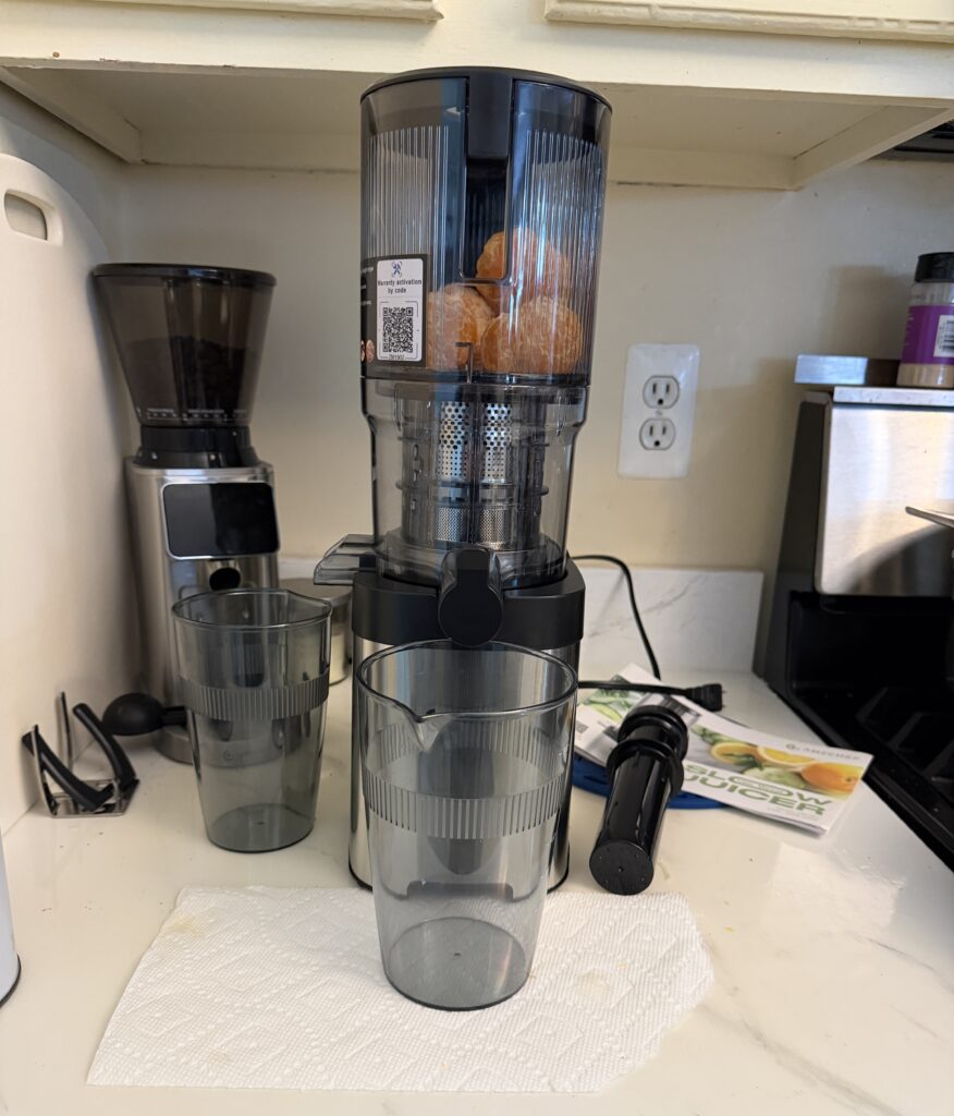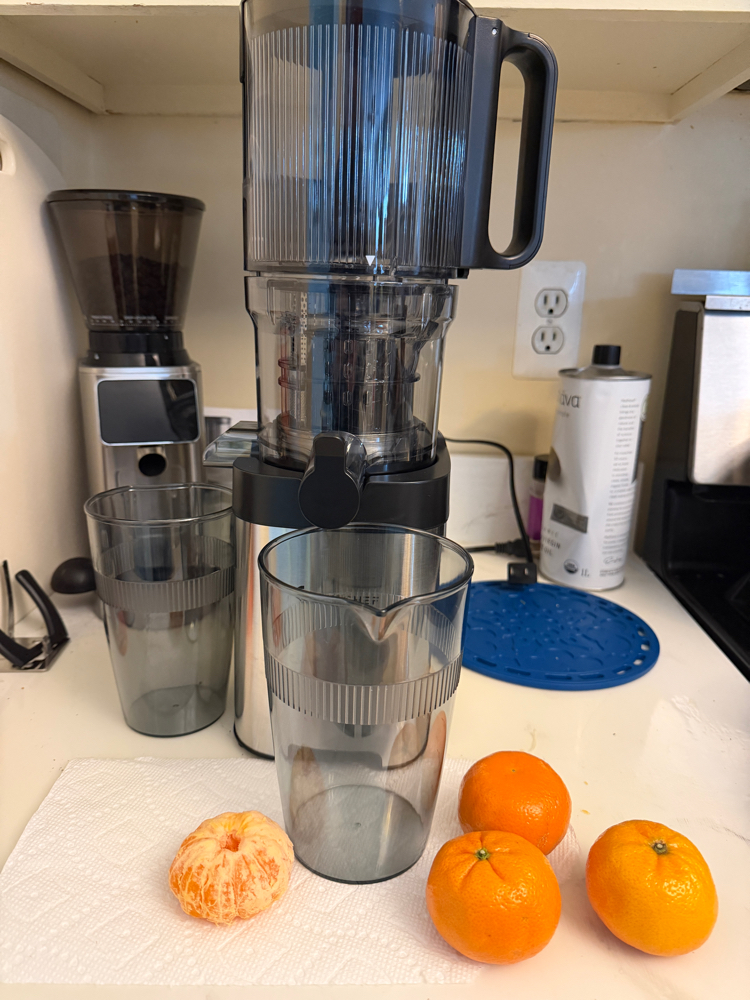 The only flaw of sorts I’ve noticed is that occasionally, a piece of orange might get stuck either beneath the augur or on top of it and doesn’t get juiced. When that happens, I switch the machine off and use the included plastic pusher tool, or sometimes, a chopstick, to dislodge it.