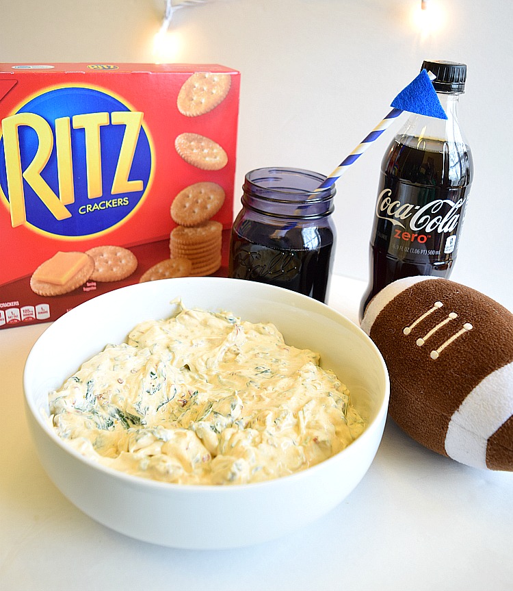 Homemade chipotle and spinach Greek yogurt dip with Coke Zero and RITZ Crackers for the big kickoff and football game party